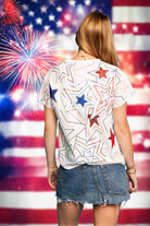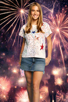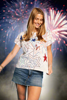 Make every day sparkle like the Fourth of July in this groovy Queen of Sparkles tee! Dazzling with red, white, and blue sequin stars scattered across the front and back, this fun-loving top brings a retro Americana vibe to your wardrobe. The relaxed fit and soft stretch cotton blend make it a comfortable pick for barbecues, concerts, or firework-filled nights. Go bold, go festive, go Queen!