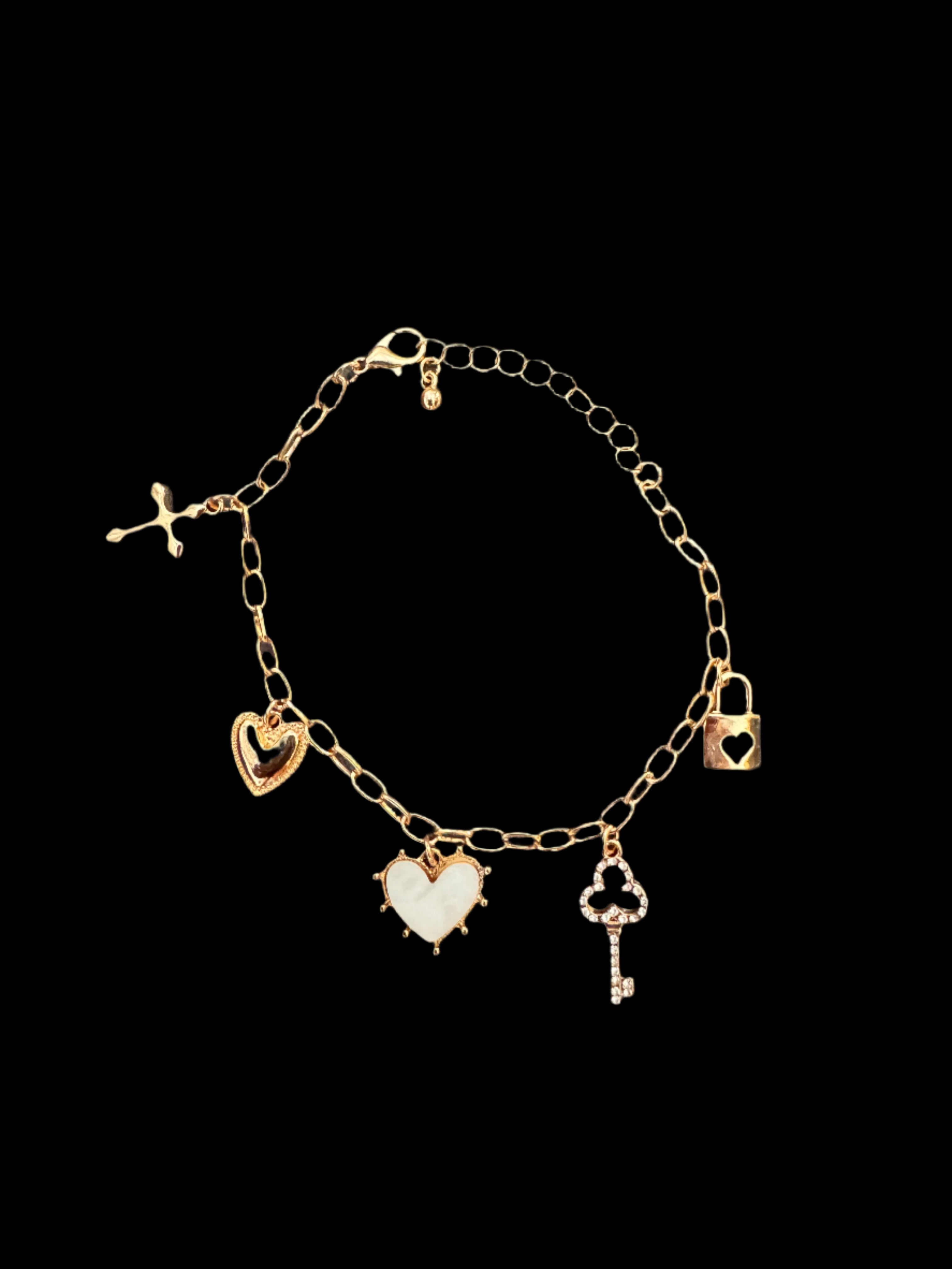 Stack your story with this darling gold-tone charm bracelet! Featuring the same swoon-worthy charm combo as the matching necklace—pearl heart, rhinestone key, dainty cross, mini lock, and more—this piece brings all the romantic vibes in a playful, polished way. The adjustable fit makes it easy to wear solo or layer up with your favorite bangles. 💛🔐
