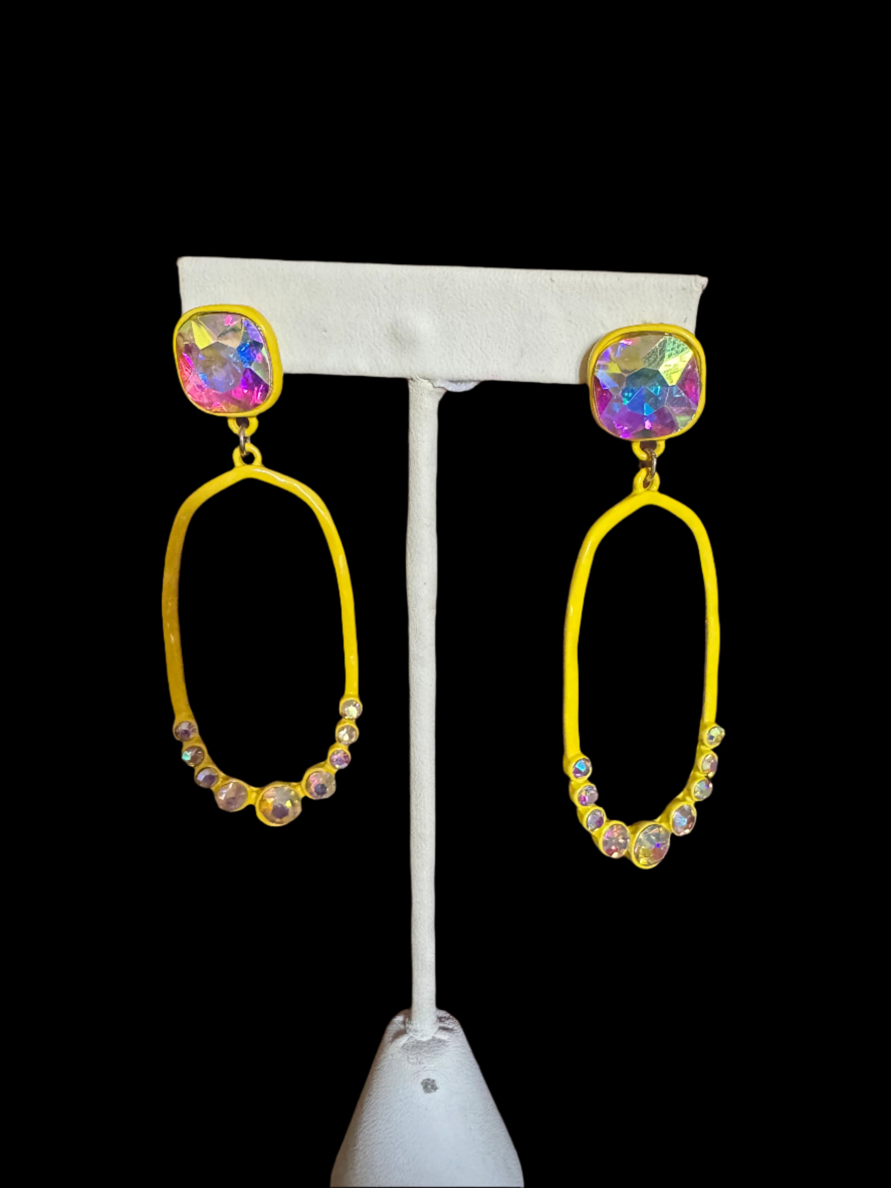 Say hello to your new favorite statement piece! These yellow ovals drop earrings feature a shimmering AB (aurora borealis) crystal stud and matching iridescent crystal accents along the base of a glossy yellow open oval frame. Lightweight yet full of bold personality, these earrings are made to turn heads at brunch, festivals, or girls' night out.