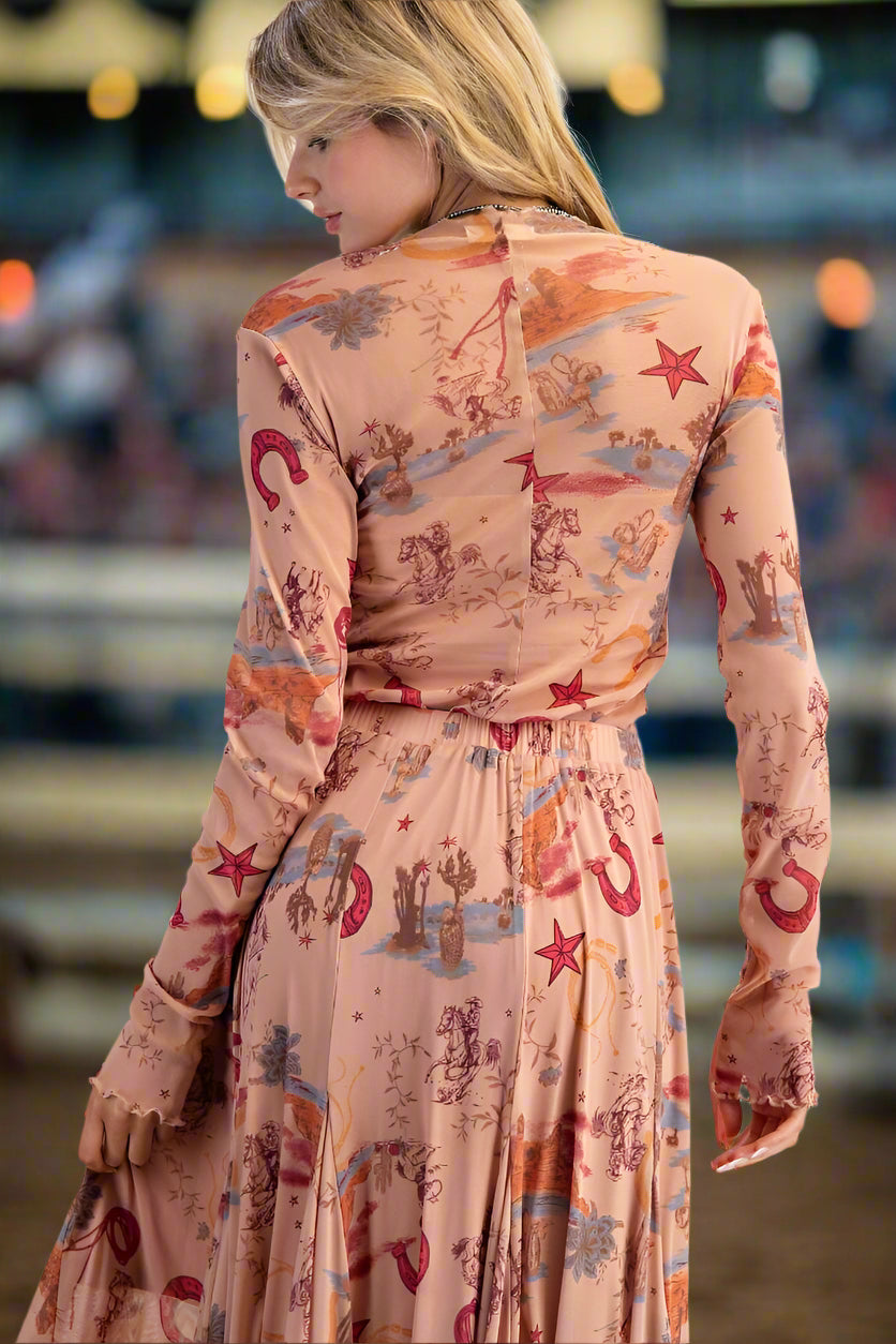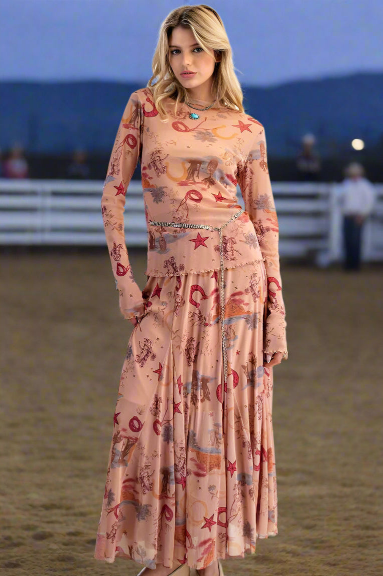 Bring your cowgirl charm to life with the Easel Western Printed Mesh Fitted Top. Made from ultra-lightweight mesh with a playful western print, this fitted long sleeve top is sheer, stretchy, and made to layer. Featuring cowboy hats, horseshoes, stars, and lassos on a soft camel background, it’s your new go-to for rodeo flair with city-girl attitude. Pair it with the matching maxi skirt or mix it up with denim or leather for a versatile look that’s bold and fun.