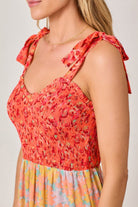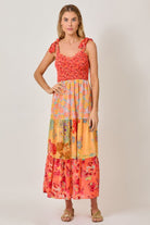 Fall in love with effortless boho style in this vibrant Mystree Tiered Maxi Dress. Featuring flirty shoulder ties, a flattering smocked bodice, and a dreamy patchwork of floral prints in warm hues, this dress flows beautifully with every step. Whether you're headed to brunch, a beach getaway, or a summer soirée, this eye-catching tiered dress brings color and comfort together in one twirl-worthy piece.