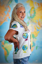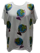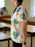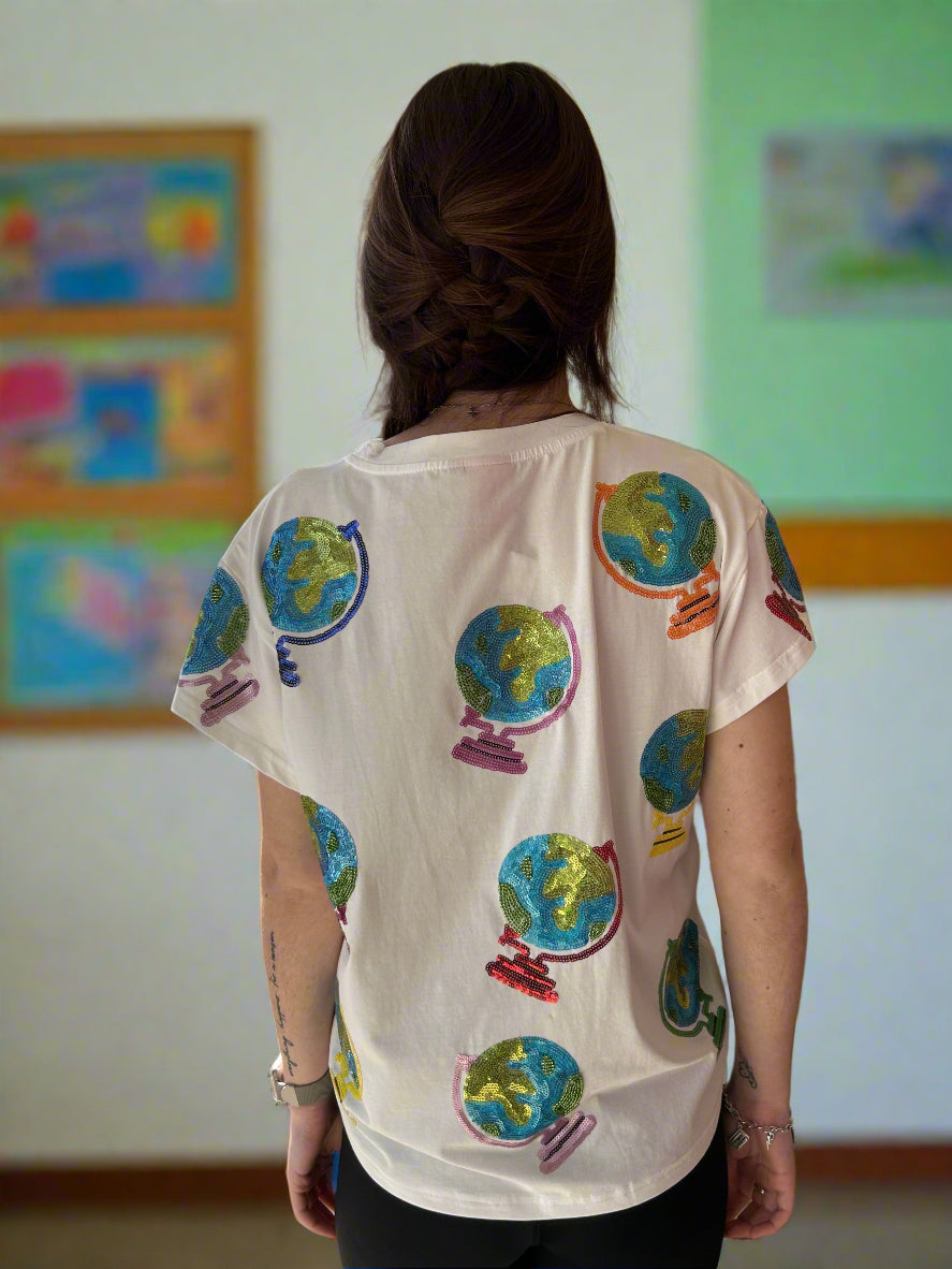 Make a bold statement with the Queen of Sparkles White Globe Tee, featuring vibrant sequin globe designs scattered across a relaxed, oversized silhouette. Made from a soft and stretchy cotton-spandex blend, this tee offers both comfort and style—perfect for travel lovers, teachers, and anyone who enjoys unique, eye-catching fashion.