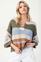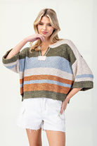 Upgrade your casual wardrobe with the ee:some Fern Striped Notch Collar Top, a perfect blend of cozy and chic. This soft knit sweater features a boxy, slightly cropped fit with 3/4 sleeves, a notch collar neckline, and stylish side slits for added movement. The striped color block pattern gives it a laid-back yet polished look—perfect for pairing with high-waisted denim or shorts.