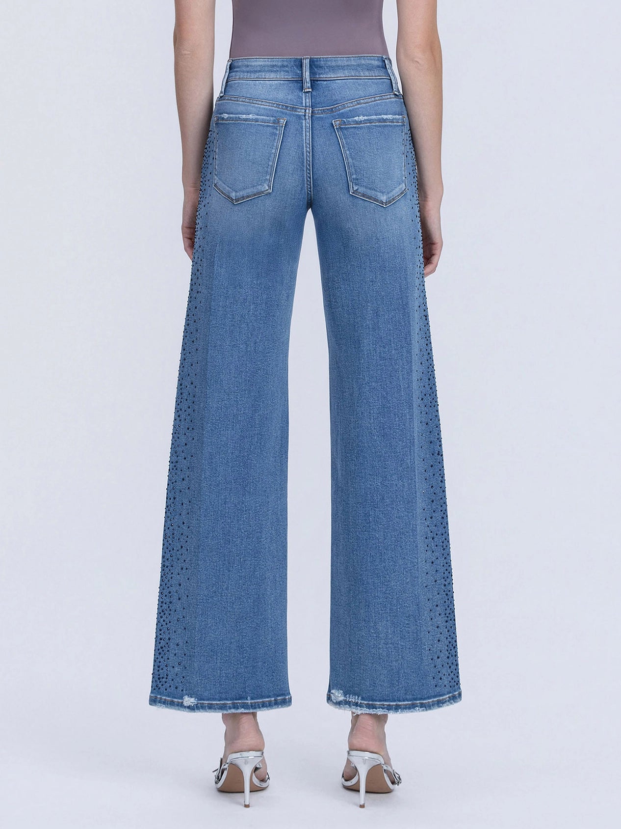 Shine a little brighter in denim that does the talking ✨ These Vervet by Flying Monkey wide leg jeans bring effortless glam to your everyday style with subtle stone embellishments along the legs for just the right touch of sparkle. Designed in a flattering mid-rise with comfort stretch denim, they hug in all the right places while giving you that modern, on-trend wide leg silhouette. Dress them up with heels or keep it casual with sneakers — either way, these jeans are a total statement.