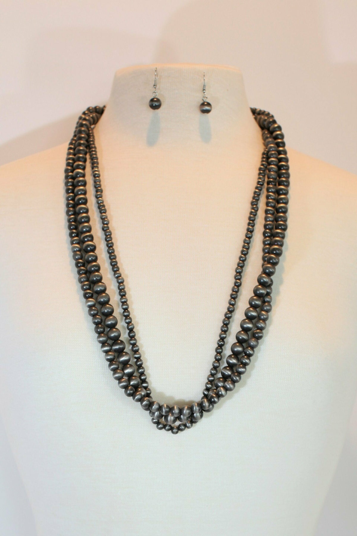 Beautiful Three Strand Beaded Necklace With Different Size Beads, Matching Earring And Bracelet.