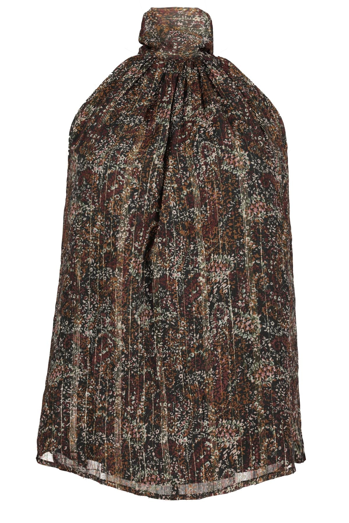 What A Beautiful Blouse In A Brown Multicolored Floral Design. Winter Colors Of Tans, Black, Burgundy, Mauves And Cream Make Up This Beautiful Fabric. Front is Fully Lined And Back Is Sheer. Drape Neck And Tie Back With Keyhole Opening. A Sleeveless Loose Fit That Skims The Body. Looks Great With Jeans, Suits, Trousers And Leather. Pair With Our Harper Vegan Leather Paper Bag Pants For A Hot Look.