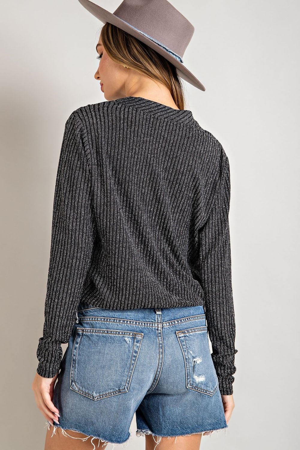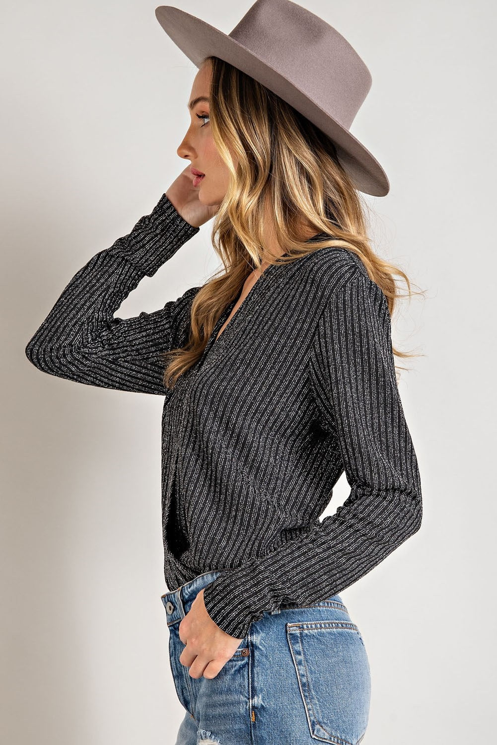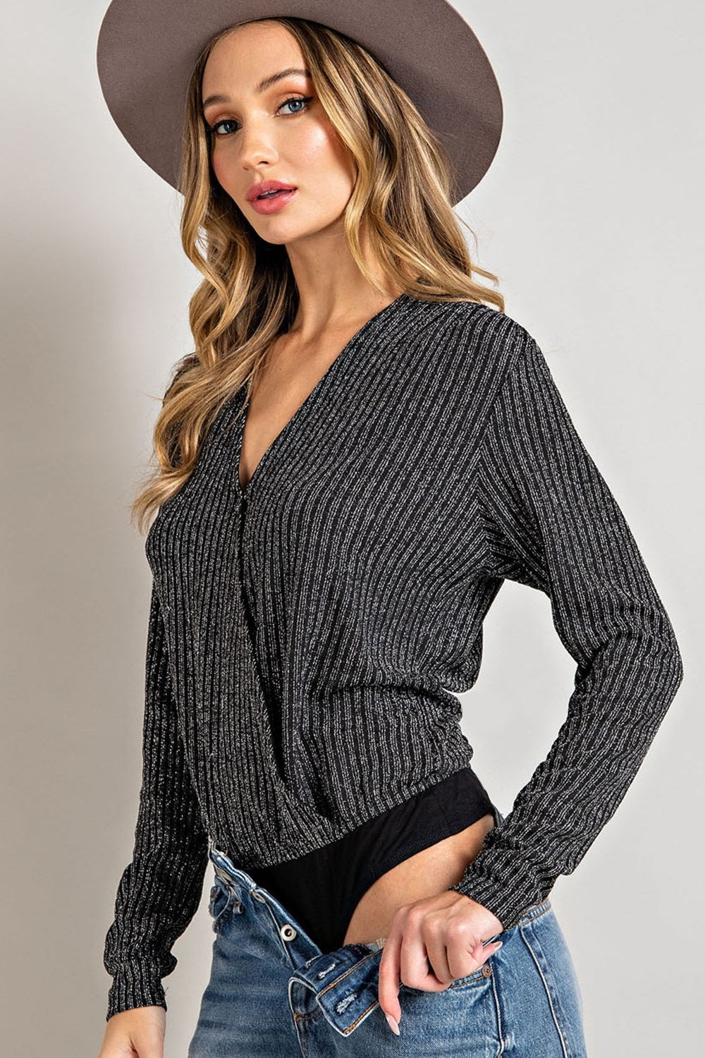 Now This Is A Bodysuit You Need For The Holidays Ahead. A Black Metallic Fabric With Enough Bling To Dress Up Anything. Designed With A V-Neckline In A Surplice Bodysuit With Long Sleeves. Grab Your Denim, Leather Skirts Or Shorts For A Awesome Look!