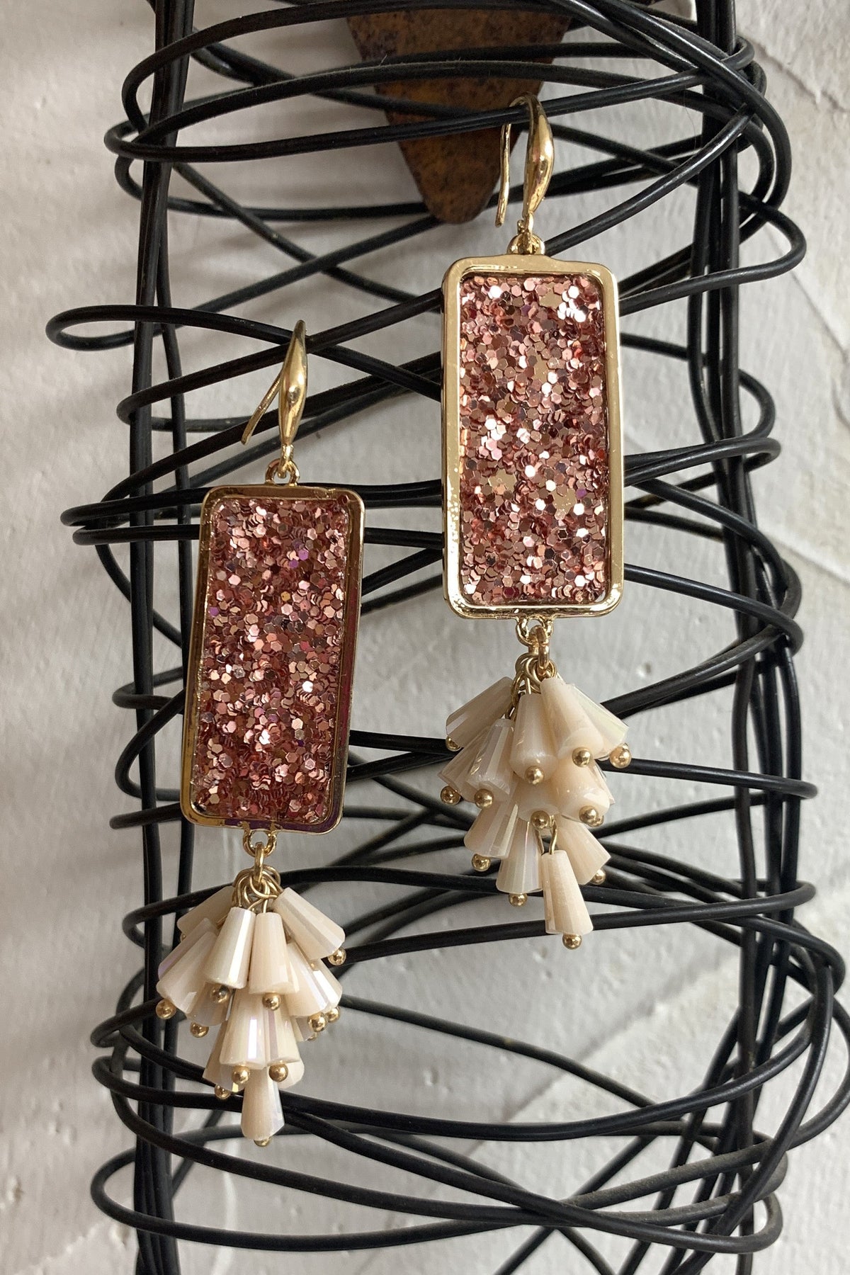 Make a bold statement with the Emma Rose Gold Sparkle Rectangle Earrings! These glittering beauties feature a rectangular rose gold sparkle inlay, framed in gold-tone metal, and finished with elegant peach beaded fringe dangles. The combination of glamorous shimmer and delicate movement makes these earrings perfect for adding a touch of luxury to any outfit—whether it's a night out, a wedding, or a special event.