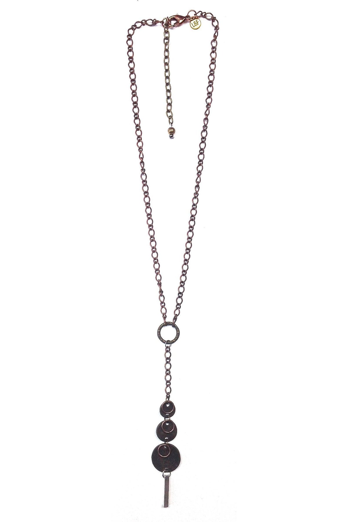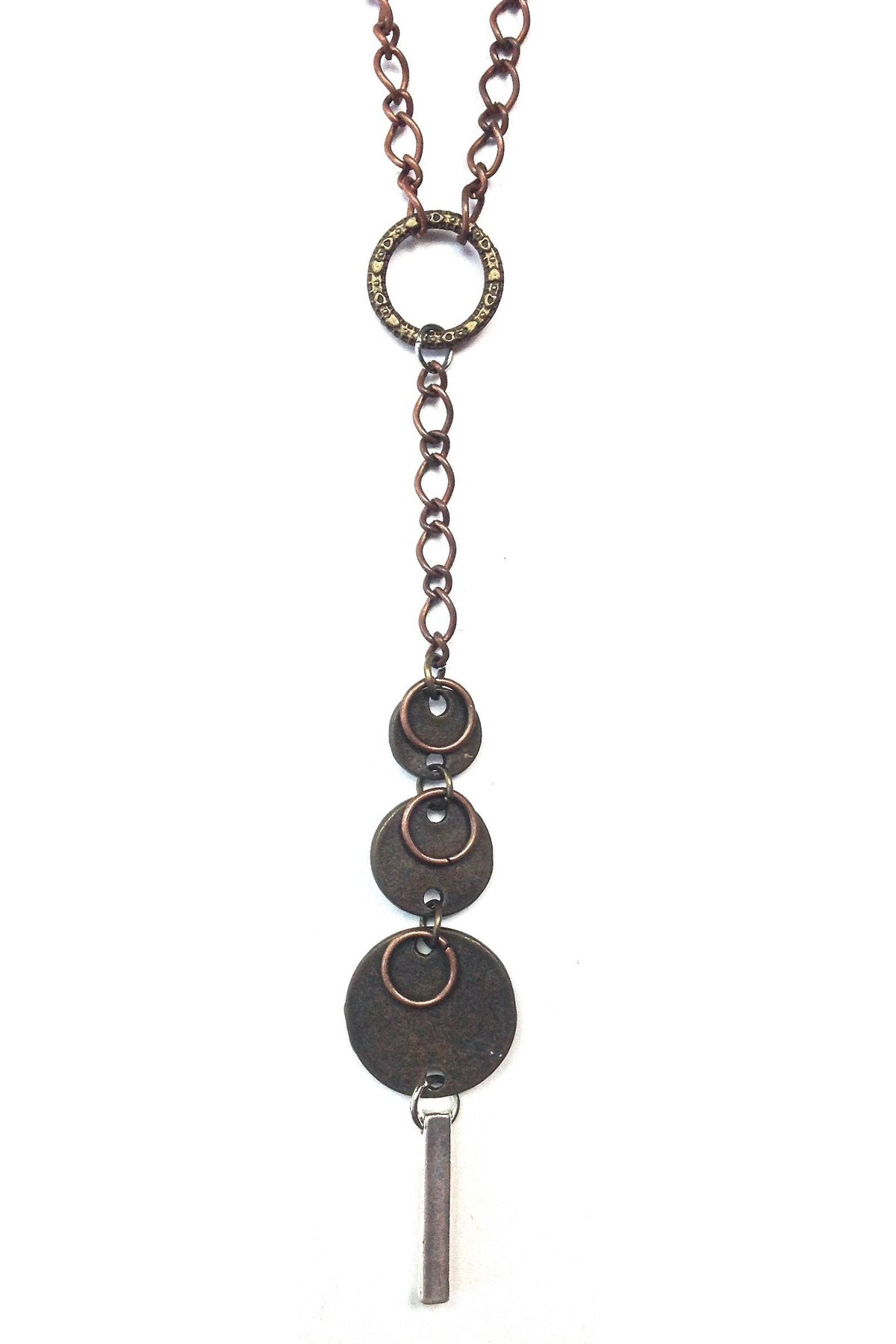 Copper Chain Necklace With Graduating Discs And Gold Dangle.