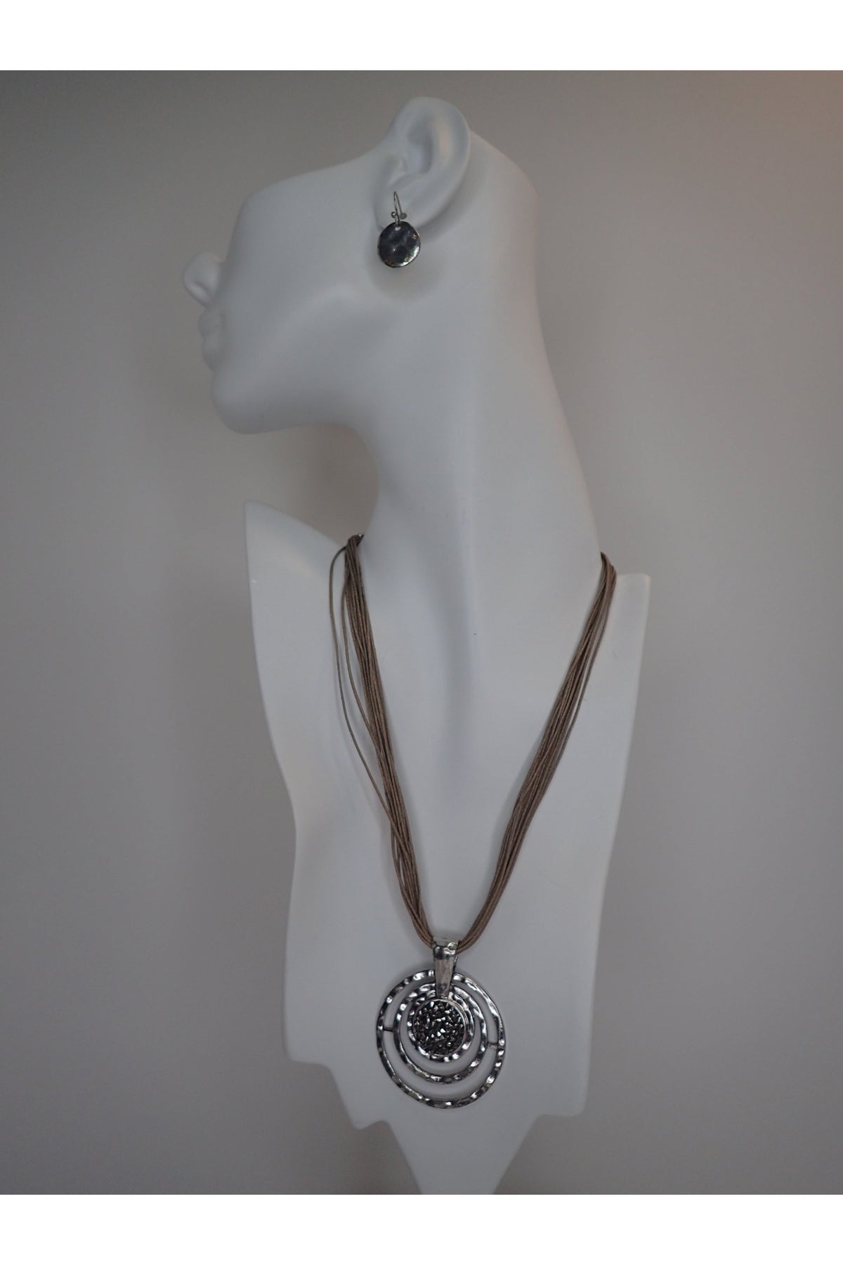 A Multi Leather Strand Necklace With Silver Circle Medallion Encrusted In Gun Metal Stones. Comes With Matching Drop Earring.