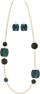 Make a bold yet elegant statement with this Rain Jewelry 2-piece set featuring a 36" long gold chain accented by chunky blue and black marbled acrylic stations. The coordinating drop earrings mirror the striking shapes and colors of the necklace, creating a cohesive and eye-catching look. Lightweight yet impactful, this set adds a pop of color and style to any outfit—day or night.