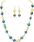 Elevate your outfit with a cool-toned cascade of elegance. This mixed-material necklace set from Rain Jewelry features rich blue stone beads, iridescent glass, brushed gold discs, and linked chain accents—all thoughtfully arranged to strike the perfect balance between bold and refined. The matching drop earrings finish the look with an effortlessly polished vibe.
