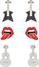 Turn up the volume on your accessory game! This fun-loving 3-piece earring set from Rain Jewelry is made for the music-obsessed and concert-ready. Featuring glittering black electric guitars, bold red-hot lips with tongue-out flair, and white acoustic guitar studs, these earrings add a playful, rockstar vibe to any outfit.