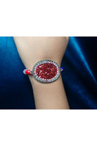Bright Red Sparkle Medallion Bracelet With AB Rhinestones around Outer Edge. Beads Are Red White And Blue Crystals. Pair With Matching Necklace And Earrings.