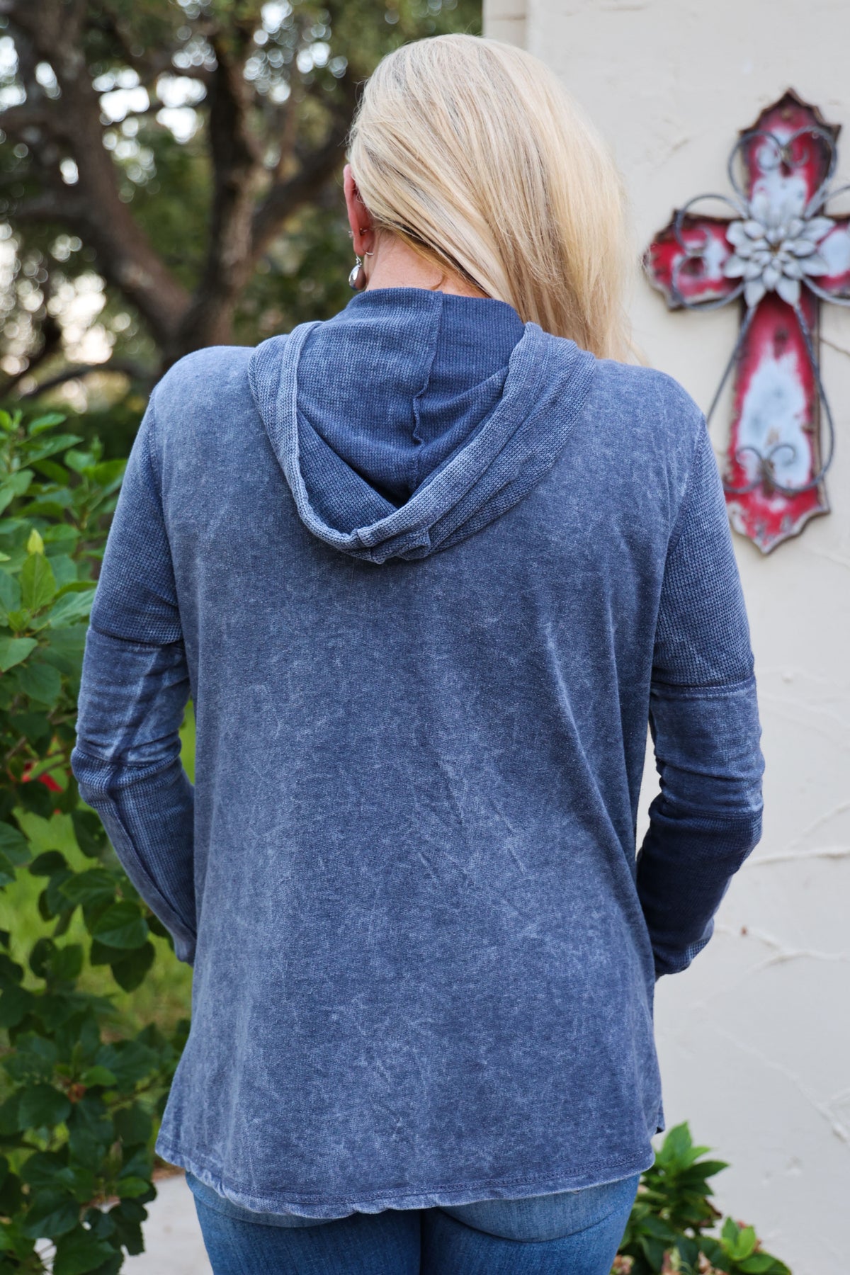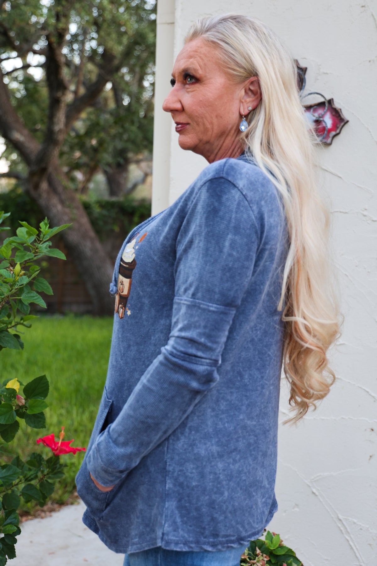 A Darling Denim Color Light Weight Sweatshirt With Hoodie, Drawstring Cord And Front Pocket. Front Has Cute Pumpkins With Spices On A Soda Cup, A Beer Glass, Coffee Cup And Ice Cream.
