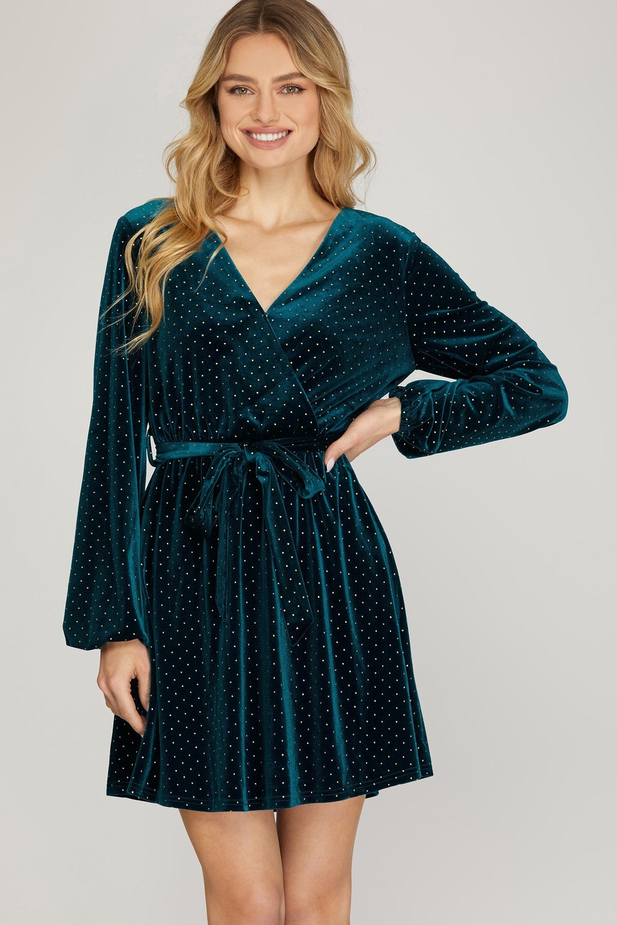 Celebrate In Style With This Showstopper Of A Holiday Dress By She & Sky! Crafted From Luxurious Teal Green Velvet With Delicate Gold-Dot Detail, You'll Be The Shimmering Star Of Any Special Occasion. Slip Into Something Special And Shine Bright!