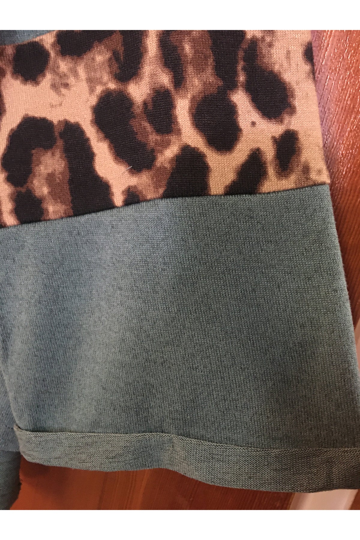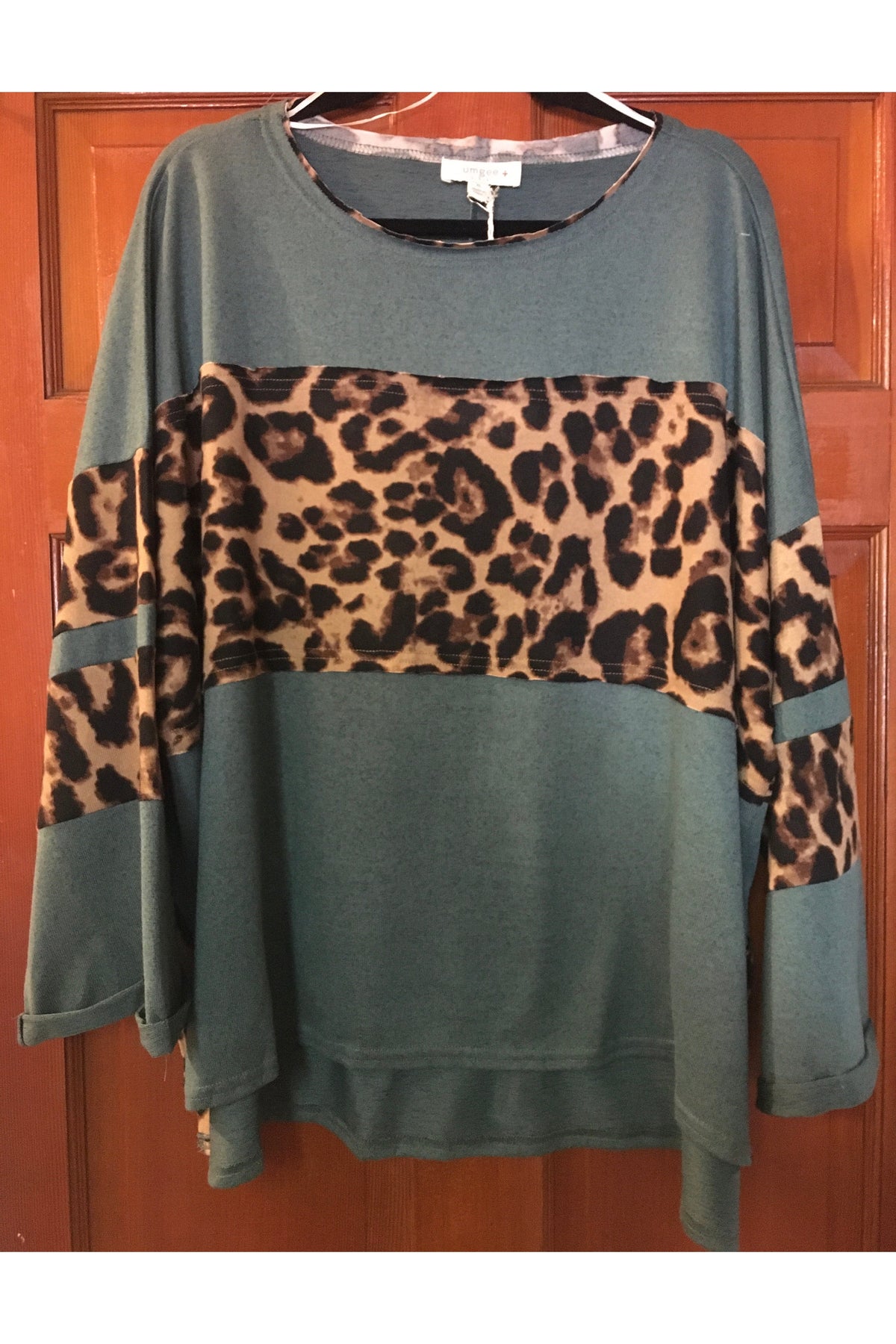 The dark teal and dark brown animal print really make this plus top pop. This top is made in light weight fabric and the cuffed sleeves are added detail. This top is perfect for work or play.
